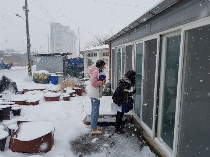 매서운 칼바람에 뒤섞여 날리는 눈발이 머리를 하얗게 뒤덮인 것도 잊은 채 방문건강 가방에서 체온계, 혈압측정기, 혈당측정기를 꺼내고 은둔형 취약계층 어르신의 체온과 혈압·혈당을 체크한다.