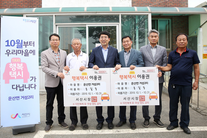 충남 서산시가 최근 운산면 거성2리 마을회관에서 ‘행복택시 확대운행 개통 행사’를 개최했다. 추가운행 지역은 운산면 거성2리, 지곡면 환성1리, 고북면 신상3리 등이다. 사진은 맹정호 시장(왼쪽에서 세 번째)과 관계자들이 기념촬영을 하는 모습.(사진제공=서산시청)