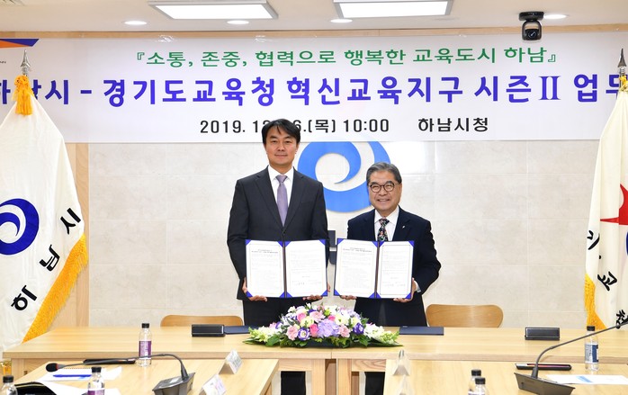 경기 하남시가 최근 경기교육청과 시청 상황실에서 학교와 지역사회가 적극적으로 소통하고 협력하는 지역교육공동체 구축을 위한 '혁신교육지구 시즌Ⅱ 업무협약'을 체결했다. 사진은 김상호 시장(왼쪽)과 이재정 교육감이 협약 체결 후 기념촬영하는 모습. (사진제공=하남시청)