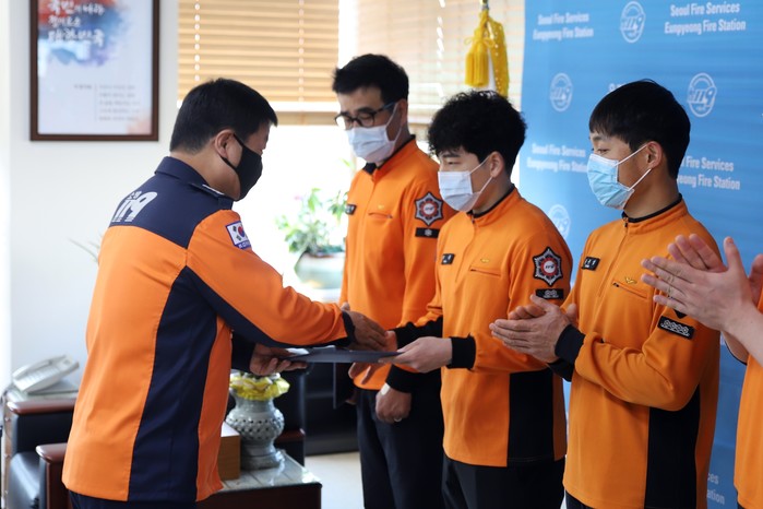 서울 은평소방서는 14일 서장실에서 심정지 시민을 살린 5명의 구급대원에게 '하트세이버(Heart-Saver) 인증서'를 수여했다. 하트세이버는 심정지 또는 호흡 정지로 죽음의 위험에 놓인 환자를 심폐소생술·심장충격기 등을 활용해 소생시킨 사람에게 주어진다. 사진은 이창식 서장이 구급대원들에게 인증서를 수여하는 모습.(사진제공=은평소방서)