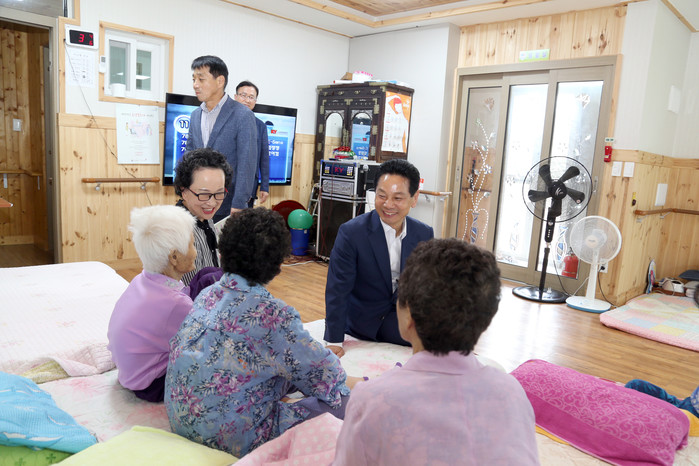 전남 영암군은 추석을 맞이해 최근 지역내 사회복지시설 13곳을 위문했다. 이날 지역내 노인요양시설 11곳과 아동복지시설인 영애원, 장애인복지시설 소정원 등을 방문해 생필품을 전달했다. 사진은 전동평 군수가 노인들과 대화를 나누는 모습. (사진제공=영암군청)