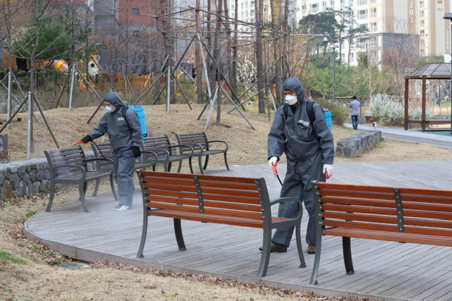 경기 하남시 풍산동 소재 성안교회가 최근 일요일 예배를 대신해 신도들과 코로나19 확산 방지를 위한 방역활동을 전개했다. 이날 방역활동은 시 청소년수련관 인근 놀이터 등 감염에 취약한 청소년 및 아동이 활동하는 공공장소에서 중점적으로 진행됐다. 사진은 방역활동 모습. (사진제공=하남시청)