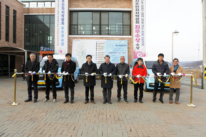 세종도시교통공사가 20일 세종시의회 차성호 산업건설위원장을 비롯한 지역주민이 참석한 가운데 장군면 복지회관에서 수요응답형 버스 ‘두루타’ 시승행사를 개최했다. 사진은 시승행사에서 리본커팅을 하고 있는 참석자들의 모습.(사진제공=세종도시교통공사)