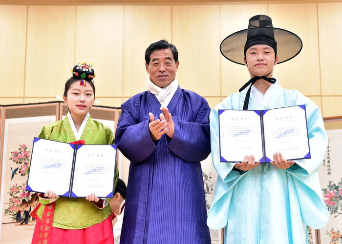 경기 안산시 행복예절관은 전통문화를 계승하고 성년의 의미를 이해할 수 있도록 돕기 위해 최근 초지고등학교 3학년 학생들을 대상으로 ‘수능 후 찾아가는 전통 성년례’를 개최했다. 사진은 윤화섭 시장(가운데)과 학생들이 기념촬영을 하는 모습.(사진제공=안산시청)