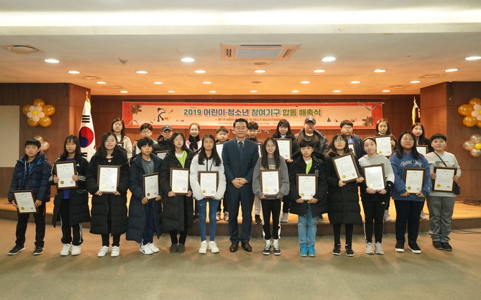 서울 성북구가 최근 구청 다목적홀에서 구 청소년 참여기구 학생 및 대학생 멘토 등 120여명이 참석한 가운데 '2019 어린이·청소년 참여기구 합동 해촉식'을 열고 1년간의 활동을 마무리했다. 사진은 이승로 구청장(가운데)과 청소년들의 기념촬영 모습. (사진제공=성북구청)