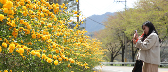 차황면은 황매산 철쭉과 함께 색다른 볼거리를 제공하기 위해 도로변에 황매화를 심어 가꾸고 있다.