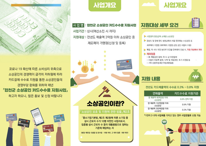 합천군(군수 문준희)은 소상공인들의 안정적인 경영활동을 지원하고자 영세 소상공인들의 카드 수수료 일부를 지원한다.지원대상은 전년도(2020년도) 매출액 3억원 이하의 제로페이 가맹점 소상공인으로 휴·폐업중인 업체, 타 시·군 이전업체, 도박 및 투기 조장업 등을 제외한 업종의 소상공인은 신청가능하다.