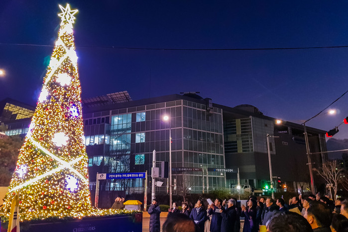 서울 광진구 광장동과 장로회신학대학교가 최근 광장동 시립광진청소년센터 앞 교통섬에 대형 크리스마스 트리를 설치하고 점등식을 진행했다. 사진은 점등식에 참석한 시민들이 트리를 바라보고 있는 모습.(사진제공=광진구청)