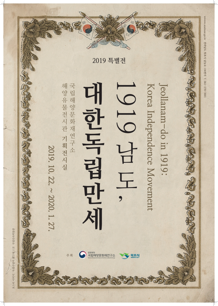 목포시(시장 김종식)와 국립해양문화재연구소(소장 이귀영)은 오는 22일 개막식을 시작으로 2020년 1월 27일까지 특별전 『1919 남도, 대한독립만세!』를 해양유물전시관에서 공동으로 개최한다.(사진제공=국립해양문화재연구소)