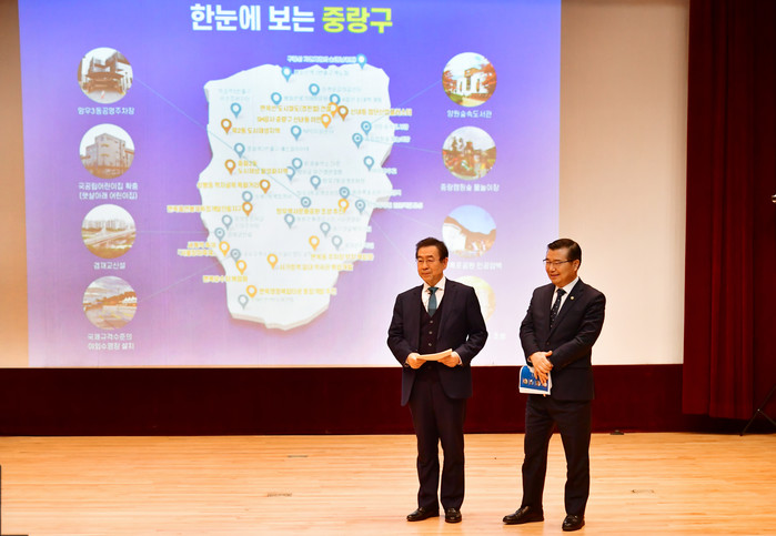 서울 중랑구는 최근 구청 대강당에서 주민 600여명이 참석한 가운데 ‘서울시장과 함께하는 중랑구 2020 예산설명회’를 개최했다. 예산설명회는 박원순 시장이 2020년 새해 서울시 예산을 25개 전 자치구를 돌며 시민들에게 직접 설명하는 자리로 25개 자치구 중 중랑구에서 제일 먼저 열렸다. 사진은 류경기 구청장(오른쪽)이 중랑구사업을 설명하고 있는 모습.(사진제공=중랑구청)
