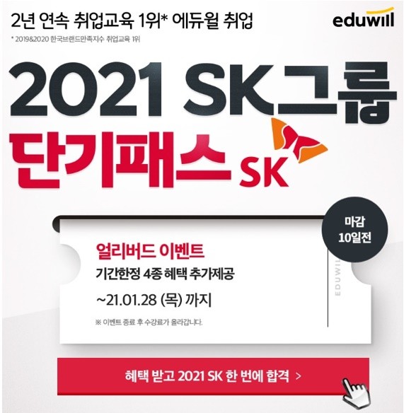[시민일보 = 여영준 기자] 종합교육기업 에듀윌(대표 박명규) 취업은 SK그룹 취업을 목표로 하는 취준생들을 위한 ‘2021 SK그룹 단기패스’를 운영한다고 밝혔다.