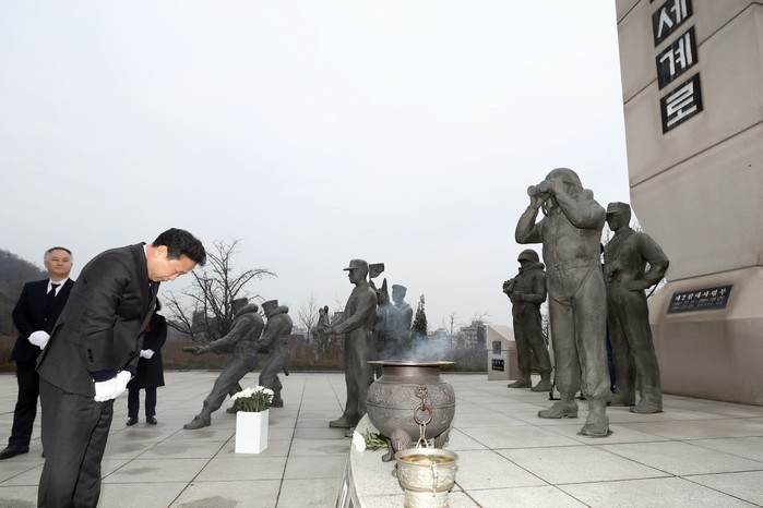 장정민 인천 옹진군수가 서해 수호를 위해 희생과 공헌한 호국영웅들의 숭고한 정신을 기리고 나라사랑 정신 함양을 위해 27일 해군 제2함대 기념탑에서 열린 '제5회 서해 수호의 날 기념 참배 행사'에 참석했다. 사진은 장 군수가 헌화 후 묵념을 하는 모습. (사진제공=옹진군청)