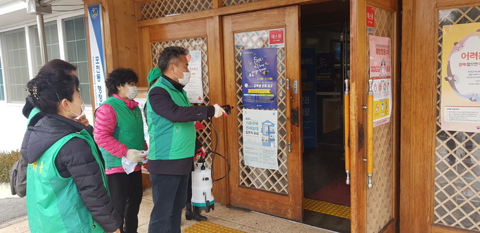 경기 포천시 포천동 새마을지도자회와 부녀회는 13일 코로나19 확산 방지를 위해 지역내 다중이용시설을 대상으로 방역활동을 했다. 이날 동 행정복지센터, 주민자치센터 등을 소독제 분무기를 활용해 소독했다. 사진은 소독을 하는 모습.(사진제공=포천시청)
