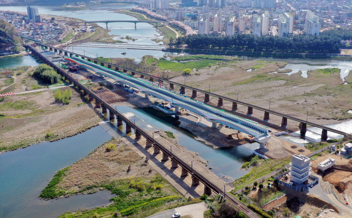 최신 공법인 유도상 슬래브 형식으로 한국철도시설공단에서 시행하고 있는 철도교는 총연장 복선 656m에 교각 13기, 상판 12개를 연결하는 공사로 현재 교각10기, 상판 9개를 설치완료한 상태다.