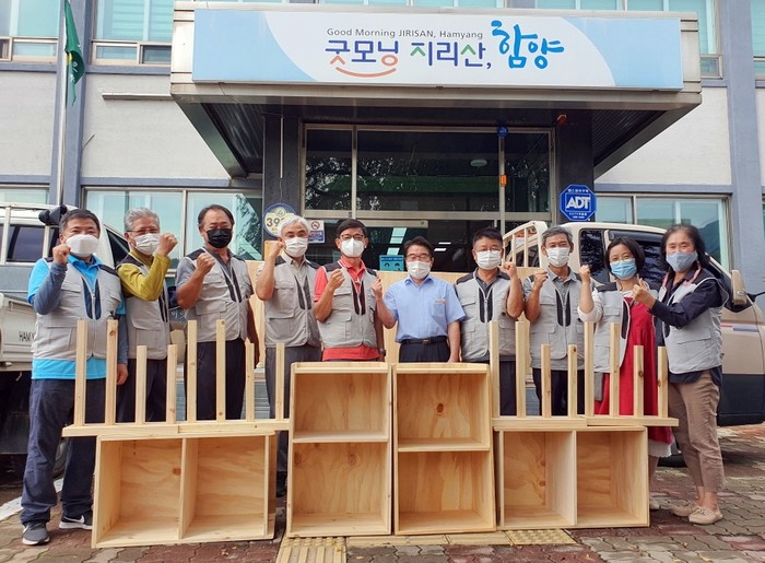 경남 함양지역 재능기부 단체인 우리 동네 목공 만물 제작소 목공예 동호인들이 지역사회 봉사활동으로 코로나 방역물품 비치함 18개와 장화꽂이 10개를 만들어 지난 10일 서하면에 기탁했다.