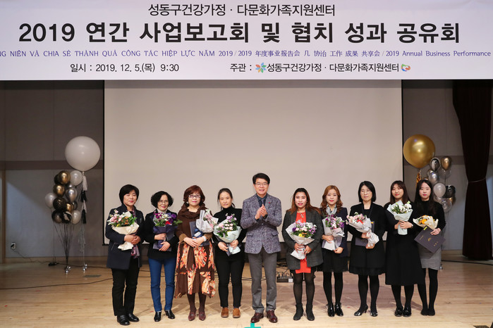 서울 성동구는 최근 시립성동청소년센터 무지개극장에서 다문화가족, 가족봉사단 등 200명과 ‘건강가정·다문화가족지원센터 연간 사업보고회 및 협치 성과 공유회’를 개최했다. 사진은 정원오 구청장(왼쪽에서 다섯 번째)과 주민들이 기념촬영을 하는 모습.(사진제공=성동구청)