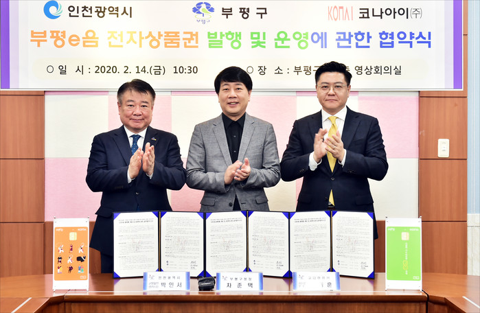 인천 부평구는 14일 인천시, 코나아이(주)와 함께 '부평e음 전자상품권 발행 및 운영에 관한 3자협약'을 체결하고 오는 3월2일부터 부평e음 전자상품권을 발행하기로 했다. 사진은 차준택 구청장(가운데)과 관계자들이 기념촬영을 하는 모습.(사진제공=부평구청)