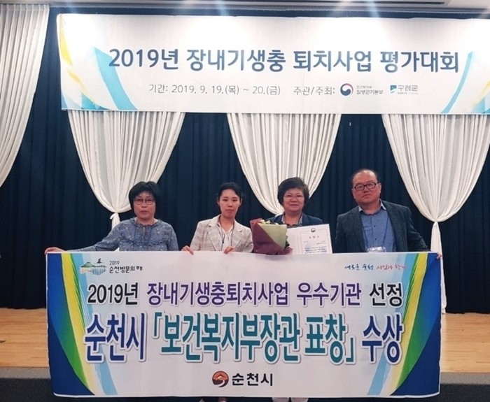 전남 순천시는 최근 기생충 예방과 조기발견을 위해 체계적이고 효율적으로 수행한 공로를 인정받아 ‘2019년 장내기생충 퇴치 사업 평가대회’에서 우수기관으로 선정돼 보건복지부장관상을 받았다. 사진은 관계자들이 기념촬영을 하는 모습. (사진제공=순천시청)
