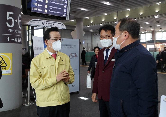 정순균 서울 강남구청장이 21일 오전 10시30분쯤 강남구에 위치한 수서역 SRT 고속철도에 방문해 운영 현장을 둘러보며 코로나19를 막기 위한 대책을 논의했다. 사진은 수서역 SRT를 방문한 정순균 구청장(왼쪽)이 관계자와 논의하고 있는 모습.(사진제공=강남구청)