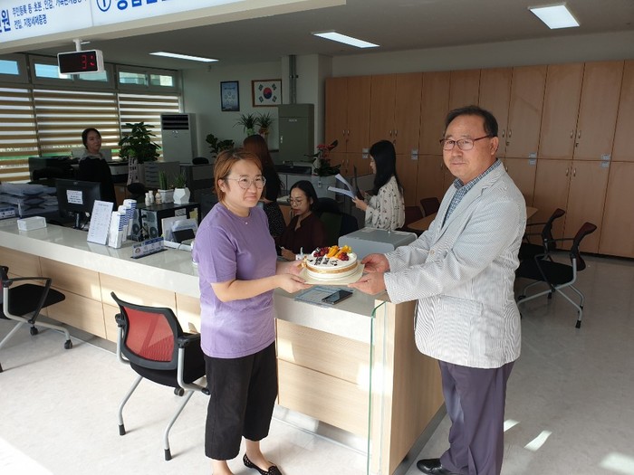 경기 이천시는 시민들의 민원 편의를 위해 안흥동 브라운스톤 상가 1층에 안흥현장민원실을 개설하고 최근 업무 개시와 함께 첫 방문한 시민에게 소정의 기념품을 증정하는 환영행사를 열었다. 사진은 첫 방문한 시민에게 케이크를 전달하는 모습. (사진제공=이천시청)