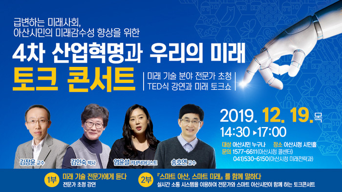 [아산=박명수 기자] 충남 아산시가 오는 19일 오후 2시30분 시청 시민홀에서 시민과 공무원을 대상으로 ‘4차 산업혁명과 우리의 미래’ 토크콘서트를 개최한다고 밝혔다.
