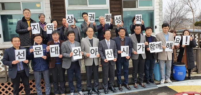 충남 아산시가 코로나19(우한폐렴)로 인해 위축된 지역경제 활성화를 위해 13일 주요 관광지 주변에서 선문대학교와 함께 손 피켓 응원을 펼쳤다. 사진은 '지역상권활성화 선문대와 아산시가 함께해요!'라는 문구의 피켓을 들고 응원하는 관계자들의 모습. (사진제공=아산시청)