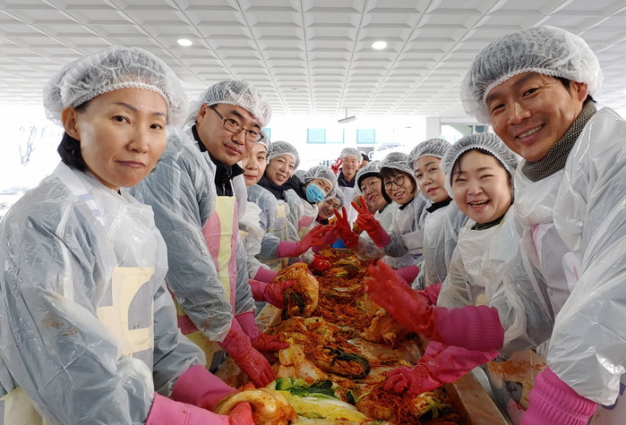 경기 안산시 단원구 선부1동 행정복지센터는 최근 1층 주차장에서 어려운 이웃을 위한 ‘사랑의 김장 나눔 행사’를 개최, 800포기의 김치를 담가 지역내 홀몸노인 등의 소외계층을 비롯해 경로당 등 복지시설에 전달했다. 사진은 기념촬영 모습.(사진제공=안산시청)