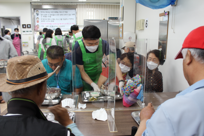 | ▲ 목포시 장애인 종합 복지관 최용희 관장(중앙)이 개관 기념식 후 복지관을 찾은 장애인들을 위해 마련한 삼계탕 식탁을 직접 배식하고 있다.(출처=목포시장애인종합복지관) |