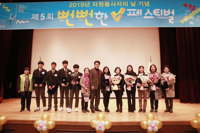 서울 관악구는 최근 자원봉사자의 날을 기념해 자원봉사자 400여명이 참석한 가운데 ‘제5회 뻔(fun)뻔(fun)한 V-Festival’을 성황리에 개최했다. 사진은 박준희 구청장(가운데)과 표창장을 받은 봉사자들이 기념촬영을 하는 모습.(사진제공=관악구청)