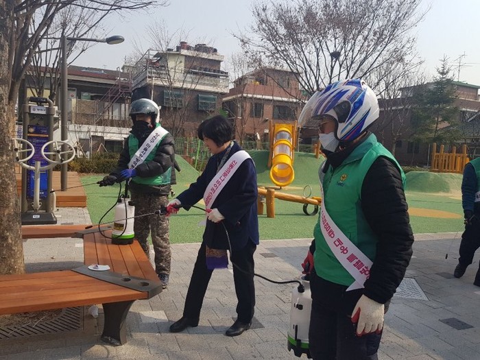 서울 양천구 신월1동이 최근 코로나19(우한폐렴) 감염증 예방을 위해 버스승차대, 어린이공원 등을 대상으로 살균 방역을 실시했다. 사진은 방역 진행 모습.(사진제공=양천구청)