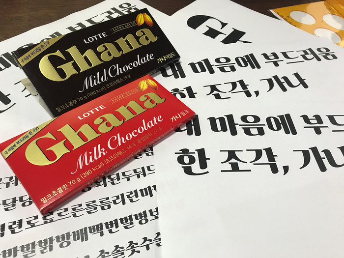 ‘가나초콜릿체’는 젊은 감성과 입 속에 넣었을 때 느껴지는 부드러운 느낌을 살렸다. ‘가나초콜릿체’ 글꼴에는 약 3도의 미세한 기울기를 주었고 곡선의 미를 살려 시각적으로 편안함과 부드러움이 느껴질 수 있도록 만들었다.