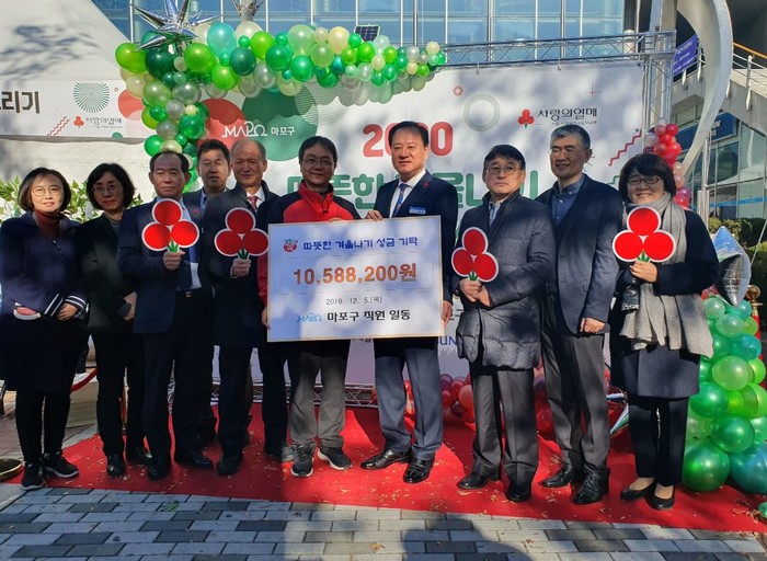 최근 서울 마포구청에서 열린 '2020 따뜻한 겨울나기 희망나눔 페스티벌'에서 유동균 구청장이 직원들과 모은 성금을 기탁했다. 성금은 사회복지공동모금회를 통해 어려운 이웃에게 전달된다. 사진은 유 구청장(오른쪽에서 네 번째)과 직원들의 기념촬영 모습. (사진제공=마포구청)
