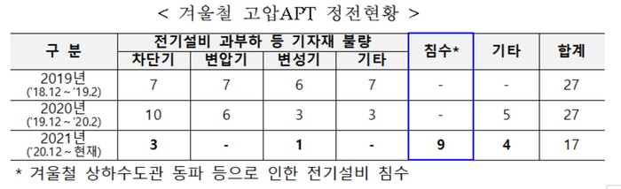 한편, 최근 한파로 인한 아파트 전기설비의 고장으로 정전이 빈번히 발생하고 있어, 아파트에서도 어느 때 보다 자체 전기설비에 대한 안전관리 강화가 필요하다.