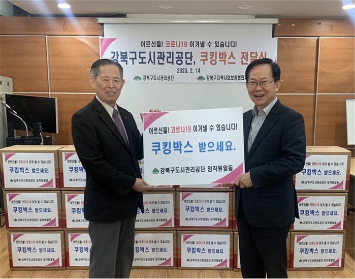 서울 강북구도시관리공단이 최근 구 지역사회보장협의체에 지역 노인을 위한 '쿠킹박스'를 전달했다. 코로나19(우한폐렴) 예방에 필요한 마스크·손 소독제와 반찬거리 등으로 구성된 이 상자는 협의체가 선정한 50명의 홀몸노인에게 전달된다. 사진은 관계자들의 기념촬영 모습. (사진제공=강북구청)