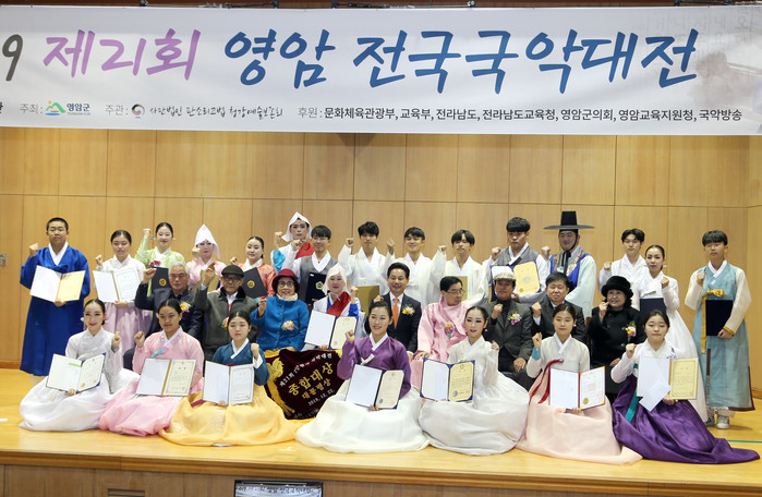 최근 전남 영암군 농업기술센터 대강당에서 개최된 ‘제21회 영암 전국국악대전’이 성황리에 막을 내렸다. 판소리, 고법, 기악, 무용 등 4개 부문에 전국 총 274명의 경연자가 참가해 경연을 펼쳤다. 사진은 수상자들이 기념촬영을 하는 모습.(사진제공=영암군청)