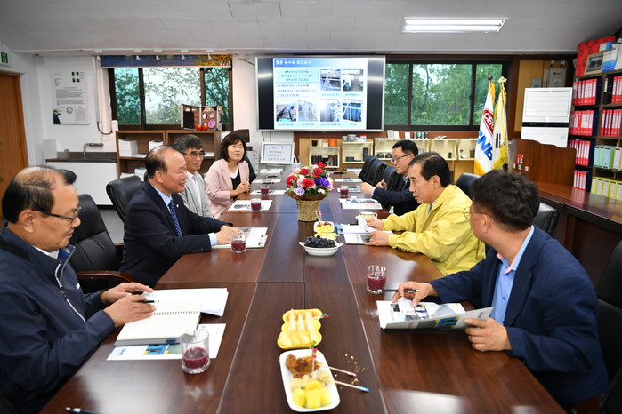 박윤국 경기 포천시장이 7일 가산면에 위치한 우수기업 (주)비앤비를 방문했다. 이날 현장 방문에서는 회사 성장과정과 제품개발에 대한 소개, 시와의 상생방안 등이 논의됐다. 사진은 박 시장과 관계자들이 이야기를 나누는 모습. (사진제공=포천시청)