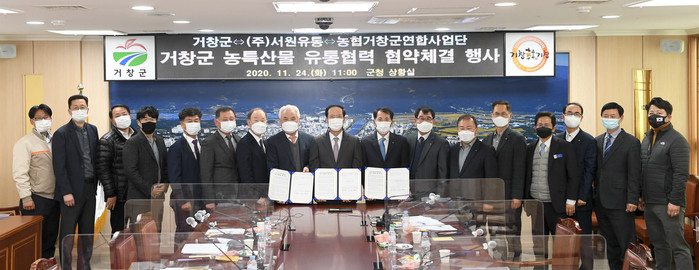 거창군은 24일 군청 상황실에서 ㈜서원유통과 농협거창군연합사업단, 지역 농협 관계자가 참석한 가운데 ‘거창군 우수 농특산물 유통 확대를 위한 업무 협약’을 체결했다.