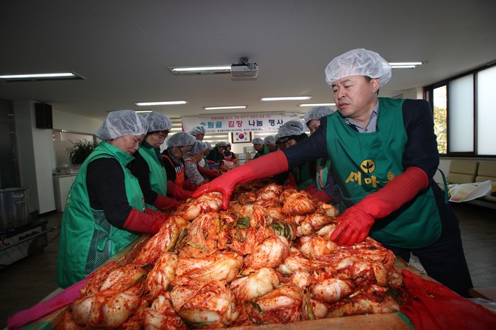 인천 동구 송림1동은 최근 새마을협의회·부녀회원 등 자생단체원 30여명이 참여한 가운데 송림골 '김장 나눔 행사'를 개최했다. 이날 담근 400포기의 김치는 지역내 홀몸노인 등에 전달된다. 사진은 행사에 참석한 허인환 구청장(오른쪽)의 모습.(사진제공=동구청)