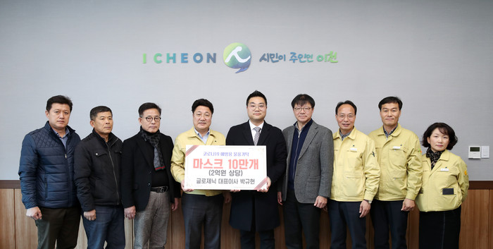 경기 이천시가 최근 마스크 제조업체 (주)글로제닉으로부터 코로나19(우한폐렴) 예방을 위한 마스크 10만개(2억원 상당)를 기탁받았다. 전달된 마스크는 국방어학원 주변 주민들에게 배부될 예정이다. 사진은 엄태준 시장(왼쪽에서 네 번째) 및 관계자들의 기념촬영 모습. (사진제공=이천시청)