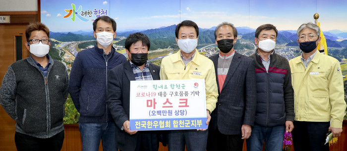 전국한우협회 합천군지부 최대원 지부장과 회원 일동은 지난 17일 합천군청을 방문 하여 농축산물 가격안정기금 1,000만원과 코로나19 극복을 위한 500만원 상당의 마스크를 기탁했다.