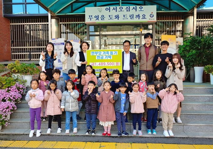 경기 하남시 아란티움 어린이집은 최근 풍산동 행정복지센터를 방문해 성금 148만9500원을 기탁했다. 이날 전달된 성금은 지역내 한부모가구 등의 어려운 이웃을 돕는 데 사용될 예정이다. 사진은 원아들과 관계자들이 기념촬영을 하는 모습.(사진제공=하남시청)