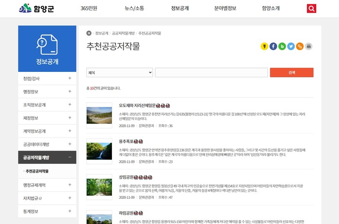 경남 함양군은 군에서 보유하고 있는 주요 관광지의 아름다운 사진을 군민과 국민들이 이용할 수 있도록 홈페이지 내에 공공저작물개방 코너를 개설했다.