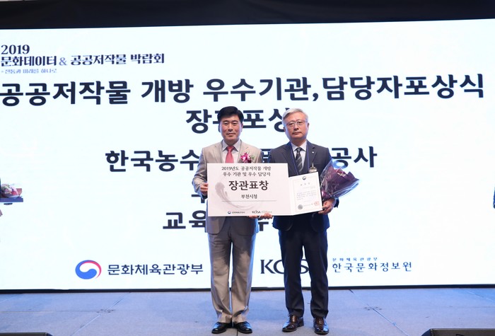 경기 부천시가 최근 서울 임피리얼팰리스 호텔에서 열린 ‘2019년 문화빅데이터·공공저작물 박람회’에서 공공저작물 개방 및 이용 활성화 우수기관으로 선정돼 대상인 문화체육관광부 장관상을 받았다. 사진은 수상 후 기념촬영을 하는 모습.(사진제공=부천시청)