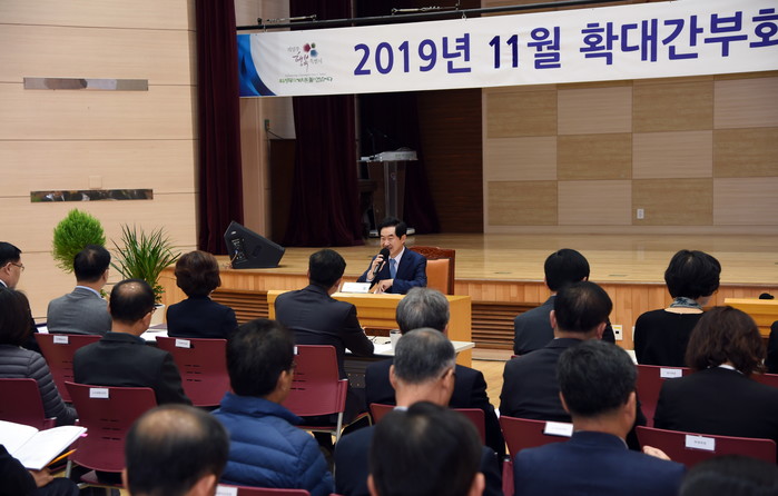 경기 의정부시는 최근 시청 대강당에서 국·단·소·권역동장 및 부서장 80여명이 참석한 가운데 확대간부회의를 개최, 호원치매안심센터 설치 등 시 주요현안 사업에 대해 논의했다. 사진은 안병용 시장이 인사말을 전하고 있는 모습.(사진제공=의정부시청)