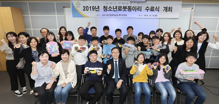 서울 금천구가 최근 구청 평생학습관 제1강의실에서 ‘2019년 무한상상 스페이스 청소년 로봇동아리 수료식’을 개최했다. 사진은 수료식에 참석한 유성훈 구청장(앞줄 가운데)과 로봇동아리 학생들이 기념촬영을 하고 있는 모습.(사진제공=금천구청)