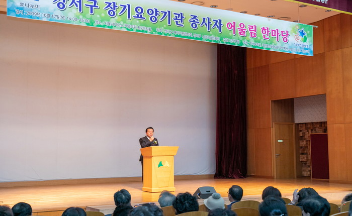 노현송 서울 강서구청장은 최근 서울시니어스 가양타워에서 근무환경이 열악한 장기요양기관 종사자들의 노고를 격려하기 위해 열린 ‘장기요양기관 종사자 어울림 한마당’ 행사에 참석했다. 사진은 노 구청장이 감사의 말을 전하는 모습.(사진제공=강서구청)