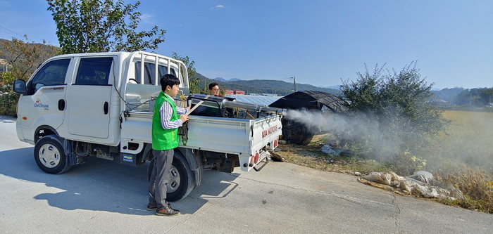 경기 동두천시 상패동 새마을지도자 자율방역반은 아프리카돼지열병(ASF) 확산 방지를 위해 최근 축산농가가 많이 밀집해 있는 8~10통 일대를 중심으로 약 2시간 동안 집중 방역을 실시했다. 사진은 방역반이 소독작업을 하고 있는 모습.(사진제공=동두천시청)