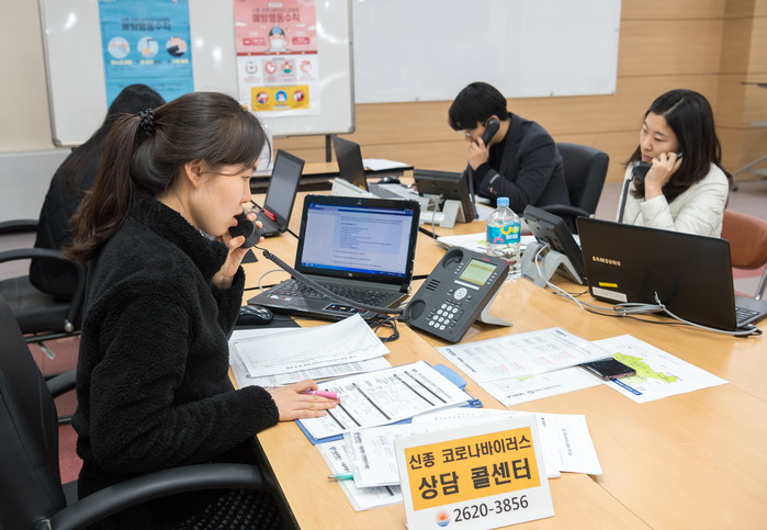 서울 양천구가 신종코로나바이러스 감염증(우한 폐렴)에 대한 구민들의 불안감을 해소하기 위해 상담전용 회선을 개통, 우한폐렴 관련 예방 수칙과 대응방안을 안내하고 있다. 사진은 양천구보건소 신고전화 상담 콜센터에서 직원들이 우한폐렴과 관련된 전화 상담을 진행하고 있는 모습.(사진제공=양천구청)