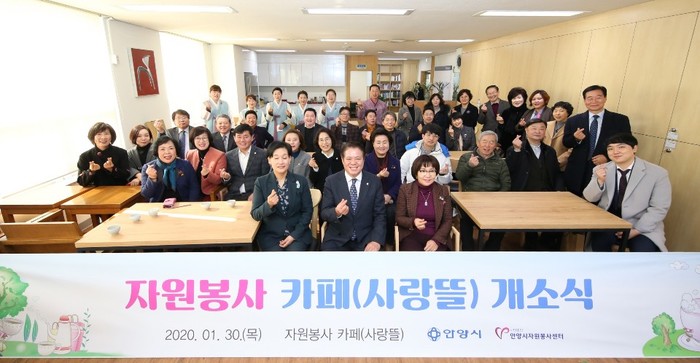 경기 안양시가 최근 시청 별관 3층에 자원봉사센터 봉사자들을 위한 카페 '사랑뜰'을 문 열었다. 앞으로 이 카페는 봉사자들이 관련 정보 등을 교환하는 소통의 공간으로 활용된다. 사진은 개소식에 참석한 최대호 시장(앞줄 가운데) 및 관계자들의 기념촬영 모습. (사진제공=안양시청)