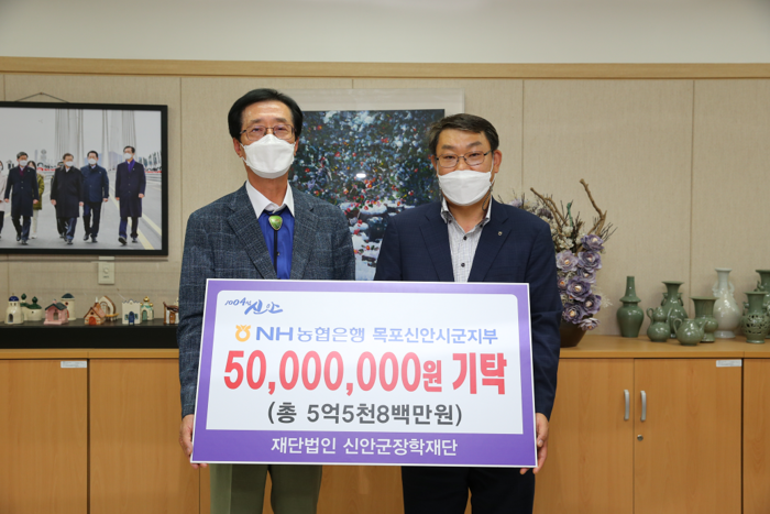 | ▲ NH농협은행 목포신안시군지부, 신안군장학재단에 장학기금 5천만원 기탁(출처=신안군) |